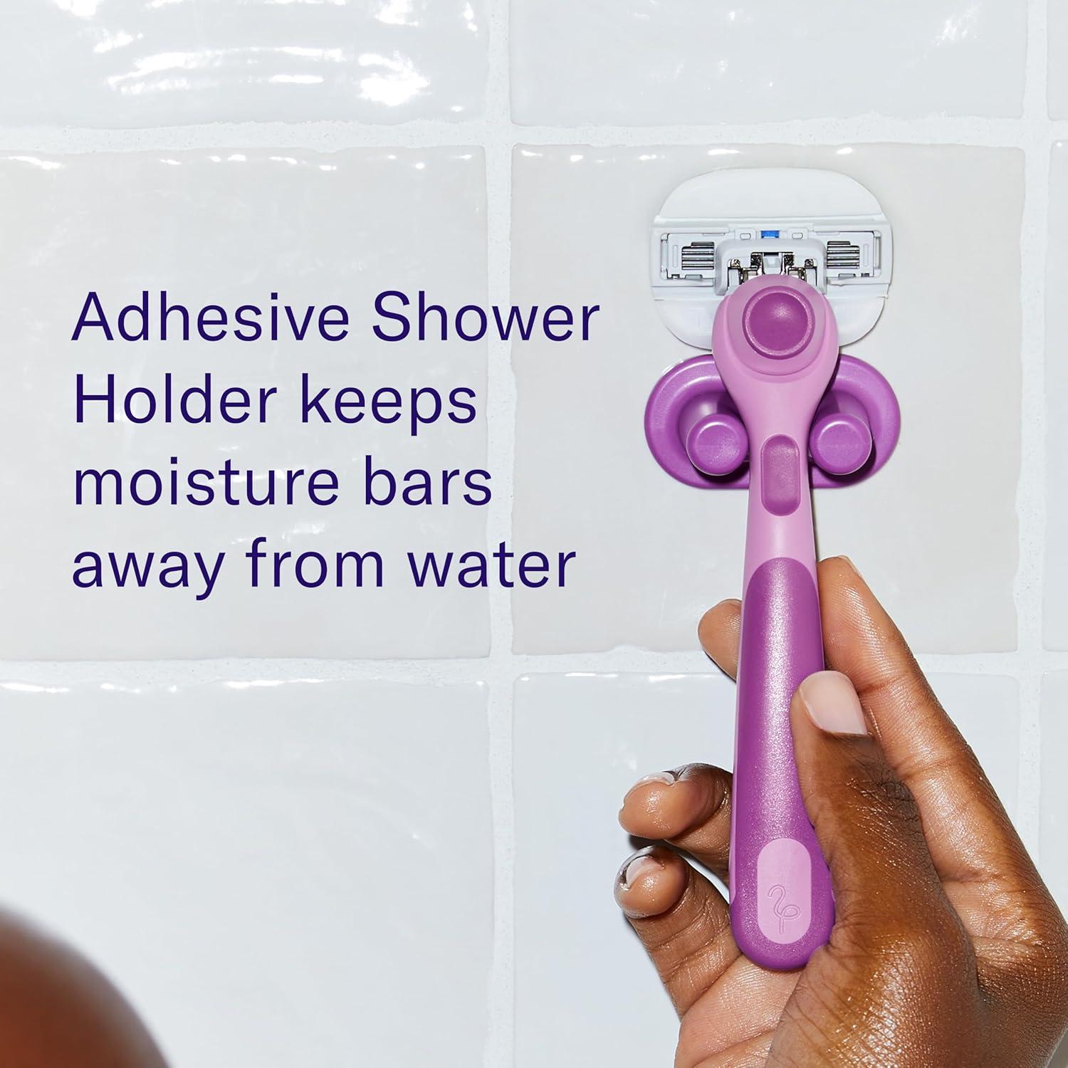 Get a close and comfortable shave in one step with Flamingo's Moisture Plus Women's Razor Set. Extra comfortable moisture bars enriched with shea butter, aloe, and coconut help protect skin while shaving. For soft and smooth skin, just add water—no shave gel needed! A flexible moisture bar glides over curves. 4 sharp stainless steel blades remove hair for a close shave. An ergonomic handle with no-slip grip feels comfortable in your hand and gives you control, even in a wet shower. A matching shower holder keeps moisture bars away from water. Flamingo Moisture Plus blade cartridge refills are exclusively designed for use with Flamingo Moisture Plus razor handle; not compatible with other Flamingo razors and blade cartridge refills.